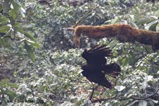 The first 40km or so takes you through much-cultivated hillsides but then you enter the Gaoligongshan reserve area through a red metal archway near an abandoned hill resort. Nearby is a government centre concerned with breeding Red Pandas but it is not open to the public. Just up the road from the reserve boundary we found a small party of Gold-naped Finches, feeding on wild raspberries. In both April and October the finches were pretty much at the same spot. Generally, though, the edible-sized birds were very shy. The reason for this became obvious when we came upon a turbanned Lisu hunter, complete with crossbow and small retriever dog.